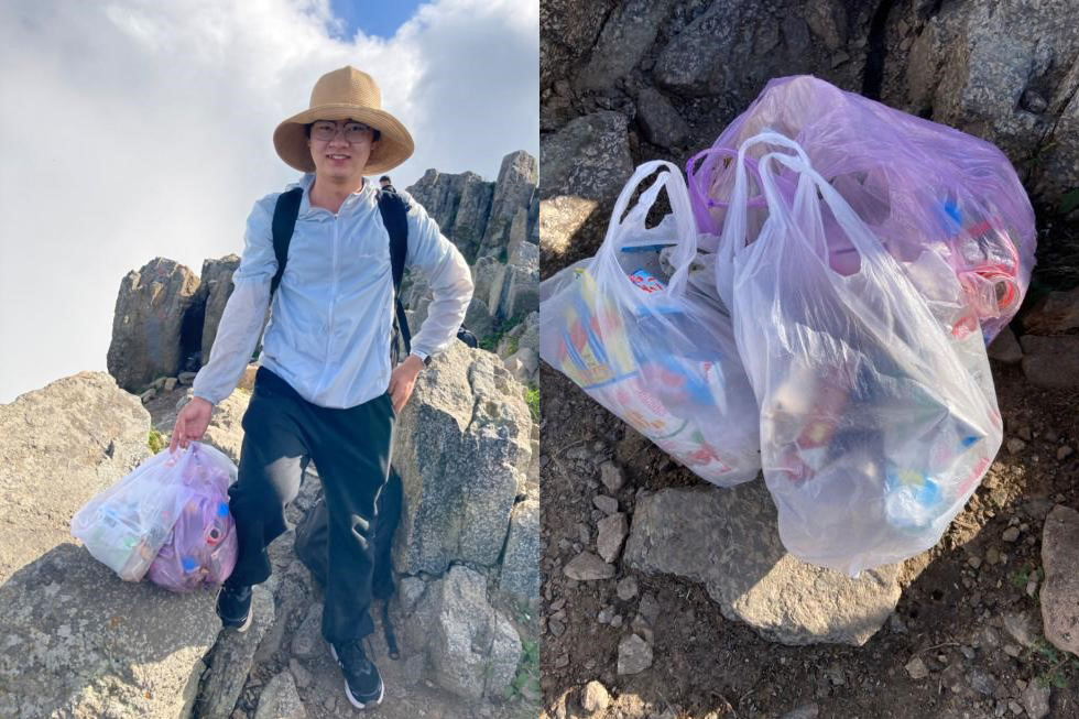 其实早在2019年,灵山就曾因为游客乱丢垃圾等破坏环境的行为而被迫关闭景区进行生态保护和恢复。此次登山途中,依旧能够看见道路两边游客丢掉的垃圾。值得表扬的是,实习组中的同学特意携带了塑料袋,在登山途中不辞辛苦地将路边垃圾拾起装进袋子中。他的行为获得了其他同学由衷的钦佩,也鼓舞大家纷纷将路边的垃圾捡起放在背包里,为保护灵山的自然环境尽一份自己的力量。