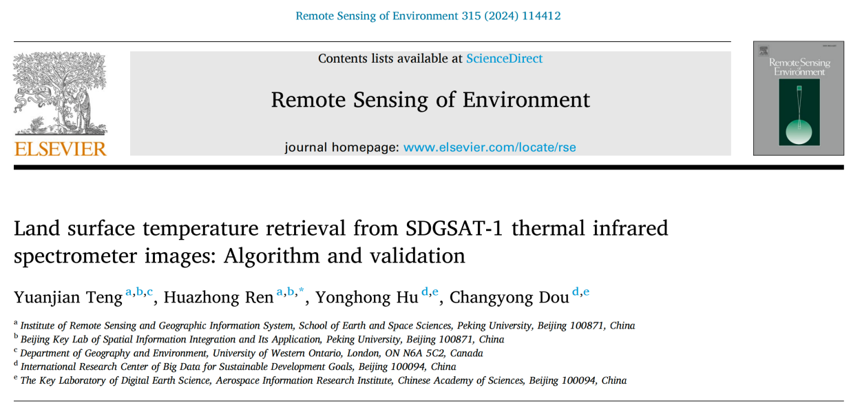 文献引用:Yuanjian Teng, Huazhong Ren*, Yonghong Hu, and Changyong Dou. Land surface temperature retrieval from SDGSAT-1 thermal infrared spectrometer images: Algorithm and validation. Remote Sensing of Environment, 2024, 315, 114412, doi: 10.1016/j.rse.2024.114412