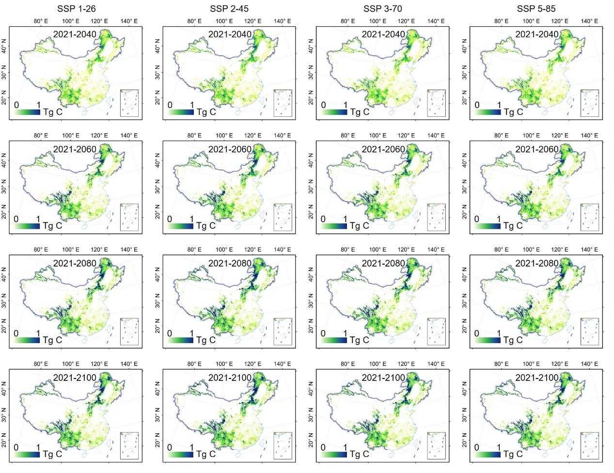 图3 不同气候情境下中国天然林地上碳储量最大恢复潜力空间分布