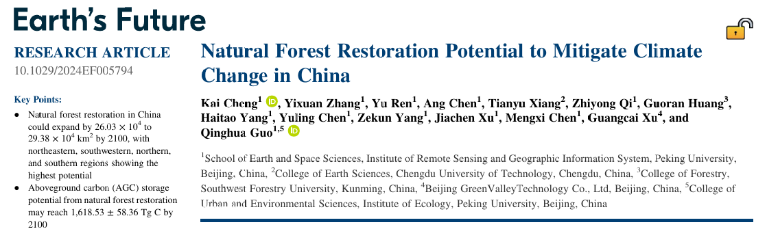 Kai Cheng, Yixuan Zhang, Yu Ren, Ang Chen, Tianyu Xiang, Zhiyong Qi, Guoran Huang, Haitao Yang, Yuling Chen, Zekun Yang, Jiachen Xu, Mengxi Chen, Guangcai Xu, Qinghua Guo. Natural forest restoration potential to mitigate climate change in China. Earth's Future, 13, e2024EF005794.