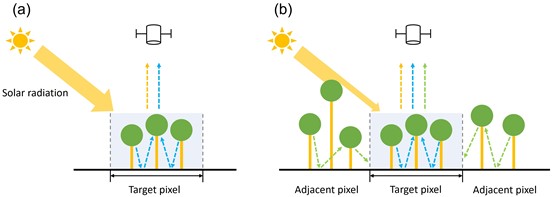 图1 不考虑(a)和考虑(b)邻近像元辐射影响时的辐射传输过程示意