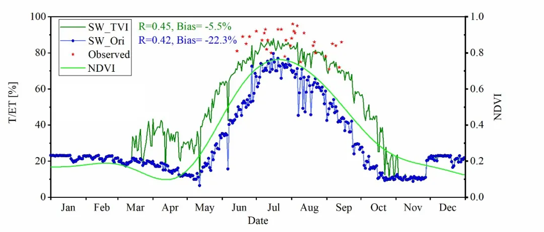 结果表明(图4):SW_TVI遥感气象蒸散发耦合模拟的T/ET比值仅比观测值低估5.5%,显著优于原始SW气象蒸散发模型的-22.3%,表明生长季SW_TVI遥感气象蒸散发耦合模型可以很好地实现蒸散发的组分分离。