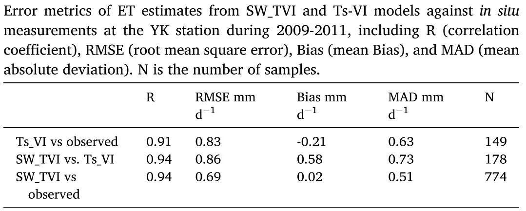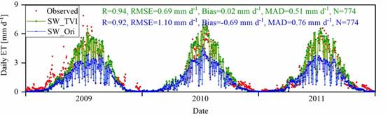 另一方面,在生长季,利用2012年5套涡动观测台站数据进行了生长季模型验证,与原始SW气象蒸散发模型相比SW_TVI遥感气象蒸散发模型的RMSE降低了55.2%,精度达到0.69 mm/d,表明SW_TVI遥感气象蒸散发耦合模型在生长季具有很好的蒸散发模拟能力。