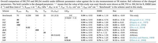 结果表明(表2):经验参数的改变对SW_TVI遥感气象蒸散发耦合模型影响非常微弱(RMSE变动小于0.1mm/d,介于0.69 mm/d-0.76 mm/d之间),但对SW气象蒸散发模型影响较大 (RMSE变动大于0.6 mm/d,介于0.76 mm/d 到1.39 mm/d 之间),表明SW_TVI遥感气象蒸散发耦合模型具有高鲁棒性和较强稳定性。