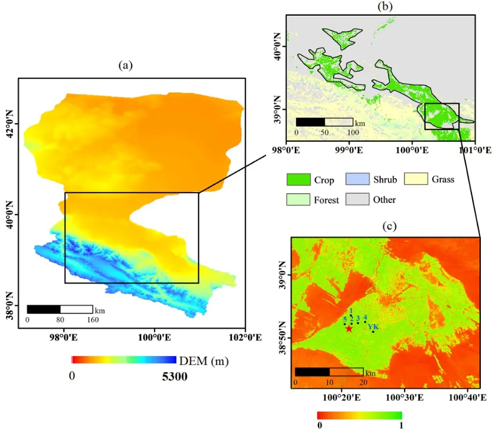 图1 我国黑河流域中部三大绿洲区分布及用于结果验证的6个涡动观测塔站