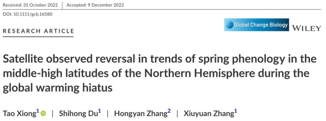 1. Xiong, T., Du, S., Zhang, H. & Zhang, X. Satellite observed reversal in trends of spring phenology in the middle‐high latitudes of the Northern Hemisphere during the global warming hiatus. Global Change Biologygcb.16580 (2023) doi:10.1111/gcb.16580.