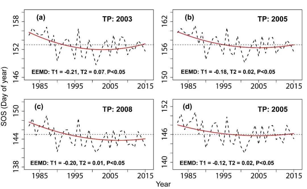 该研究首次发现基于线性假设趋势分析方法的局限性,是导致已有研究对于变暖停滞期间北半球中高纬度植被春季物候趋势出现分歧的一个重要因素。值得注意的是,这些局限性也可能发生在其它非线性生态过程的研究中,特别是考虑到全球气温在过去30多年表现出的快速升温到变暖停滞的转变。因此,在分析对温度敏感的生理和生态过程时,最好使用类似于的EEMD非线性方法来提取其内在趋势,以避免先验外部趋势对结论的干扰。