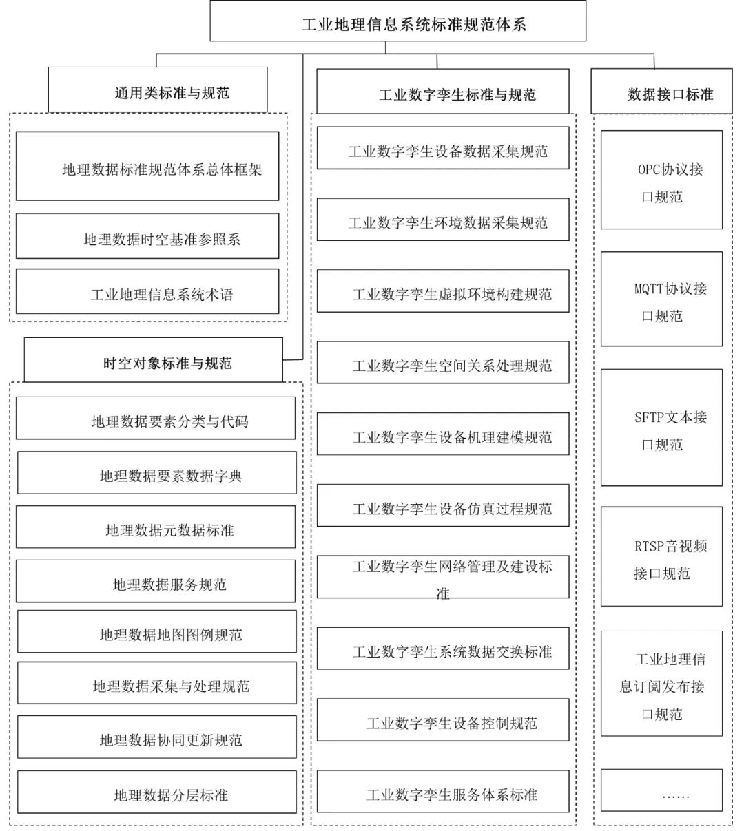 通用类、时空对象类、工业数字孪生类、数据接口类等四大类标准规范是工业地理信息系统标准规范的有机组成部分,通用类标准规范是基础框架,定义了工业地理信息系统总体时空描述原则;时空对象类标准规范侧重宏观、整体空间数据的表达与定义,在传统地理信息对象标准内容基础上,通过对象的属性拓展、拓扑关联、行为定义等方式,增加对宏观微观表达、静态动态可视化、内部外部双向联动的支持,融入对象的微观模型表达、动态属性关联、双向驱动机制等,以适应工业地理信息系统的应用需要;工业数字孪生类、数据接口类标准规范则侧重对工业对象和过程的描述及定义,基于统一的数据组织原则和编码规范体系,为工业时空对象提供微观表达、动态数据的支撑。