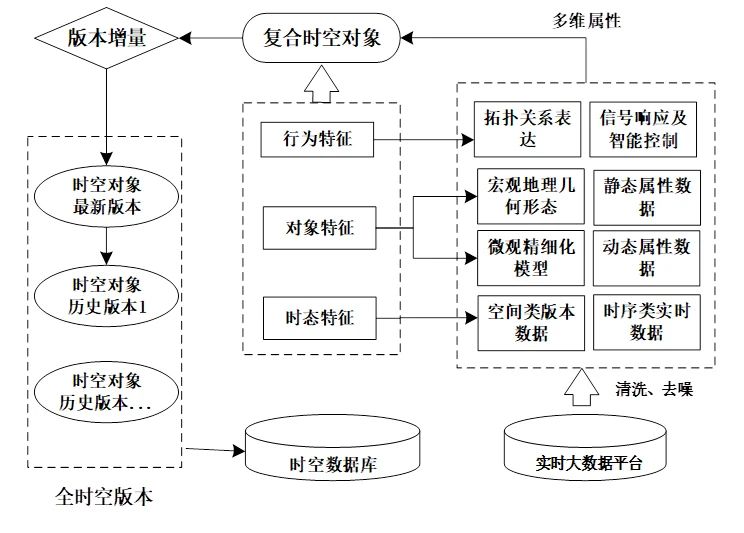 (1)在时态变化维度,对于空间类数据,以面向对象方式建立空间对象的时空变化版本,以版本增量的方式记录全时空变化过程;对于传感类实时时序数据,通过大数据实时预处理完成清洗、去噪、序列化等,以属性关联方式保存到对象,时态数据的历史版本存储在大数据处理端,工业对象通过属性关联查询应用。由于版本增量模型以单个时空对象为基本单元,以版本方式存储每次对象变化后的快照,相比传统时态GIS的快照模型和基态修正模型,以对象作为为版本管理的最小粒度,在工业地理信息系统应用场景下,可在存储空间与性能两方面达到平衡,大大提高时空对象存储和处理的效率,且更容易在计算机系统中开发实现。同时,数据的获取、编辑、分析等操作可以精确到每一个对象,在多用户并发场景下减少冲突与冗余、提高处理效率,可动态修正、实时更新及快速获取任意历史版本数据集,解决了工业对象动态时空信息处理的难点问题。