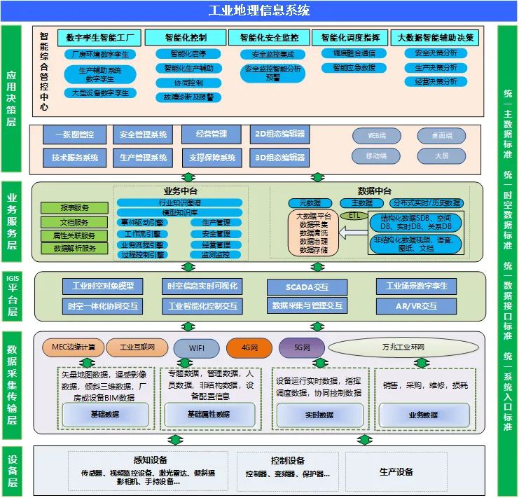 系统建立在统一主数据标准、统一时空数据标准、统一数据接口标准的基础上,充分融入物联网、云计算、大数据、数字孪生、工业控制、人工智能等现代信息技术,为工业智能化生产及安全运营提供平台支撑。系统从下向上共分为设备层、数据采集传输层、IGIS平台层、业务服务层、应用决策层。