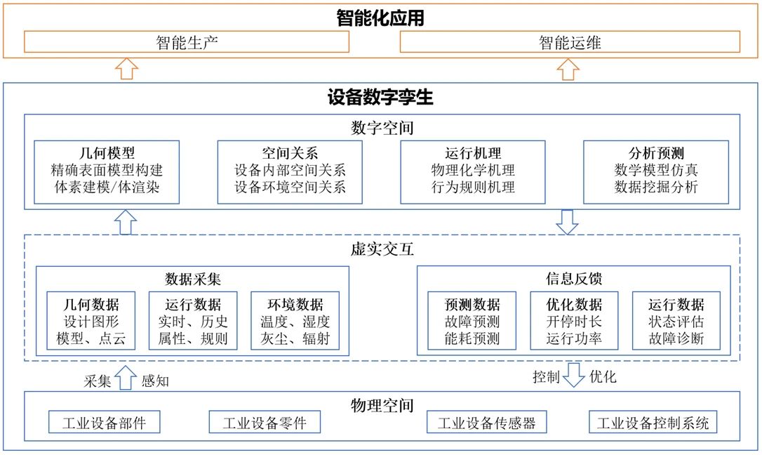 物理空间中工业设备包括设备部件、设备零件、传感器和控制系统。传感器和控制系统是区分工业设备重要条件,传感器感知整个设备的运行状态并采集实时运行数据,控制系统接收控制指令并控制设备的状态。