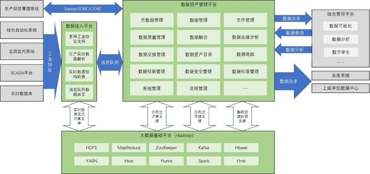 工业地理信息系统大数据分析采用大数据技术架构,为数据接入和数据资产管理平台提供多种分布式计算框架支撑,以及面向多源异构数据资源的分布式存储支撑,如图7所示。数据接入平台面向工业数据资源提供基于OPC等工业协议的实时数据接入、半结构化实时数据向结构化数据转换,以及消息队列等高效的结构化实时数据共享等能力。数据资产管理平台以大数据处理技术为支撑,以数据规划与管理方法为指导,以数据聚合、治理、融合、服务为核心,为工厂提供有效的数据资产沉淀工具,构建工厂数据资产的归集、存储、管控、治理、融合、交换及应用环境,支撑工厂元数据及数据统一管理、数据问题发现治理、数据指标加工融合以及数据资产交换共享。