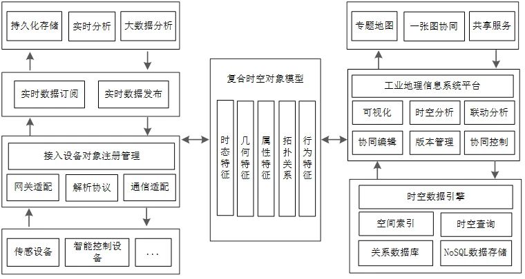 针对工业地理信息系统数据动态变化、工业对象拓扑关联、数字空间与现实空间双向联动的特点,需建立围绕工业地理信息时空对象的数据协同处理及管理机制。一方面,面向工业生产全过程产生的实时数据及传感数据,IGIS时空数据处理平台需提供稳定、高速的数据接入及发布机制,确保数字世界与物理世界的数据同步;另一方面,面向工业生产业务流程多样,涉及的工业要素对象纷繁复杂,前述关键技术已经从数据标准规范层面给出了要素对象建模的要求,从工业时空数据管理的角度还需建立基于复合时空对象模型的“一张图”时空信息协同处理平台,确保数据完整规范、无冗余、动态更新、协同一致,如图4所示。